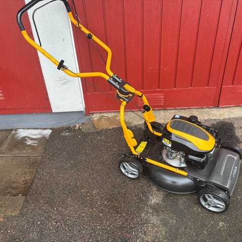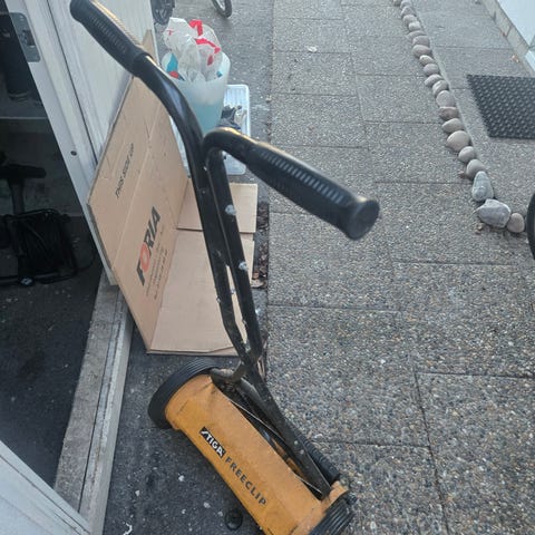 Stiga Freeclip handgräsklippare i gul färg. Modellen är en manuell cylindergräsklippare med hjul och klippcylinder framtill. Handtaget är i metall med greppdel upptill. Passar för klippning av mindre gräsytor där man vill använda en handdriven gräsklippare utan motor eller elanslutning.