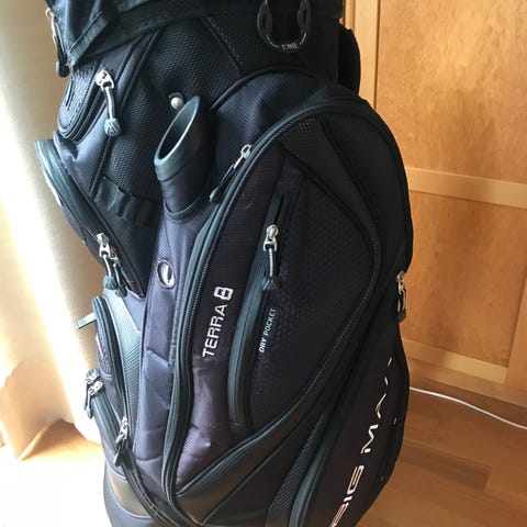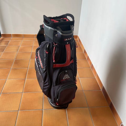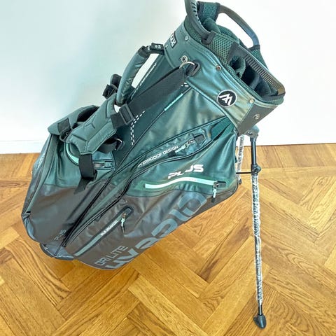 Big Max Dri Lite Silencio golfbag i beige färg. Bagen har flera rymliga fickor med dragkedja för förvaring av bollar, tillbehör och kläder. Ovandelen har individuella fack för klubborna för att hålla dem separerade och skyddade. Bagen är avsedd för golfspelare som vill ha en organiserad och väderskyddad förvaring av sina klubbor och tillbehör på banan.