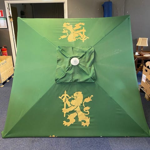 Parasoll med parasollfot, beige. Mått: 2 m i diameter. Köpt på EM-möbler. Pris 700 kr.