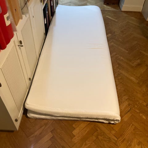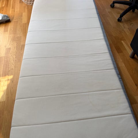 Jysk Dreamzone madrass. Madrassen har quiltat överdrag och är märkt med Oeko-Tex-certifiering. Passar som sovmadrass i 90 cm bred säng eller som gästmadrass att lägga på golvet. Madrassen är tjock och skön, totalt 11 cm i tjocklek. Är hoprullad och således enkel att transporter. Finns i Helenelund.