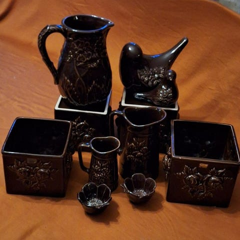 Guldkroken: Stor skål, mellan vas, liten vas & katt.