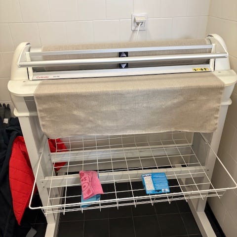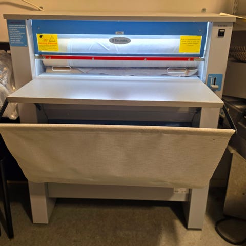 En svensktillverkad mangel med 60 cm bred mangelyta samt frontplatta för lättare inmatning.