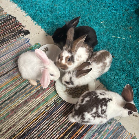 Mamma är tysk scheck och pappa är belgisk jätte. 8 ungar säljes. 6 hanar och 2 honor, varav tre är vita rödögda. Födda 3/2-26