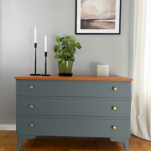Köpmansdisk målad i fin gråbeige färg och nya beslag i guld samt fötter i guld. Ovansidan mörkt trä. Helt underbar, men vi kommer tyvärr inte ha plats för den när vi flyttar.