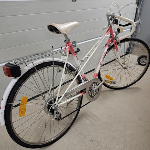 Crescent landsvägscykel för kvinna med 26" hjul. Cykeln har klassisk ram med lågt insteg, pakethållare bak, stänkskärmar och kedjeskydd. Utrustad med sadel och styre anpassade för upprätt sittställning samt reflexer på hjul och pedaler. Passar för vardagscykling på väg och cykelbana.