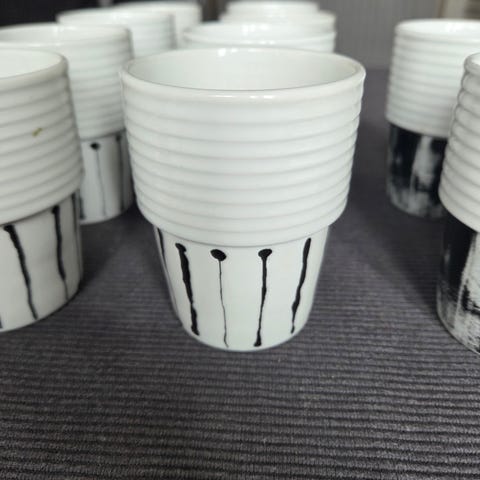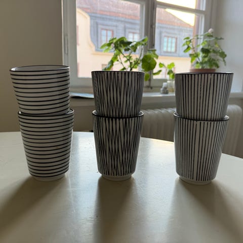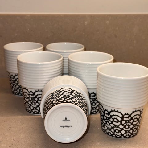 Rörstrand muggar Filipa K i porslin med olika mönster. Muggarna är cylindriska med räfflad ovandel och slät nederdel med tryckt dekor i kontrastfärg. Passar för servering av varm och kall dryck i kök, vardagsrum eller på kontor. Säljs som set enligt bild.