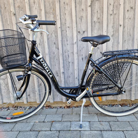 Stadscykel för kvinna med ramstorlek L och 28" hjul. Cykeln har lågt insteg, pakethållare bak och korg fram. Utrustad med fotbroms bak och handbroms fram. Passar som vardagscykel i stadsmiljö.
