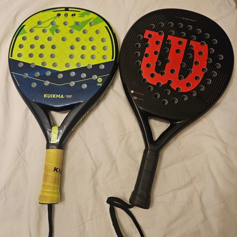 Forza Power padelracket i droppform med orange, svart och silverfärgad design. Racketet har perforerad träffyta och är avsett för padelspel. Dunlop Rocket padelracket i rund form med svart och vit design, också med perforerad träffyta. Till racketarna hör en Tasty padelväska i blå färg med flera dragkedjefack för förvaring av racketar och utrustning. Utrustningen lämpar sig för padelspel och transport av padelracketar och tillbehör.