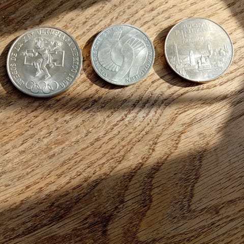 Utländska mynt i blandade valörer. På bilderna syns mynt från olika länder. Passar för den som samlar på mynt eller vill ha exempel på utländsk valuta för undervisning eller dekoration.