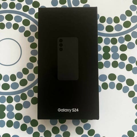 Samsung Galaxy S24 mobiltelefon med 128 GB internminne. Modellen på förpackningen är SM‑S921B/DS och färgen är Onyx Black (svart). Telefonen har 8 GB RAM enligt märkning på kartongen. Levereras i originalförpackning med produktinformation och märkning på baksidan av lådan. Passar som smartphone för vardagsanvändning, appar, surf och media med gott om lagringsutrymme för bilder, video och filer.