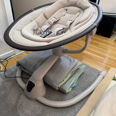 Jollyroom barnstol i form av en babysitter i beige färg. Stolen har vadderad sits med integrerat fempunktsbälte för att hålla barnet på plats. Stabil fot med bågformad bas och elektrisk enhet framtill, vilket tyder på att stolen kan ha gung- eller vibrationsfunktion. Ovanför sitsen finns en båge med mjuka leksaker. Passar för spädbarn och småbarn som behöver en bekväm och trygg plats att vila eller sitta i under uppsikt av vuxen.