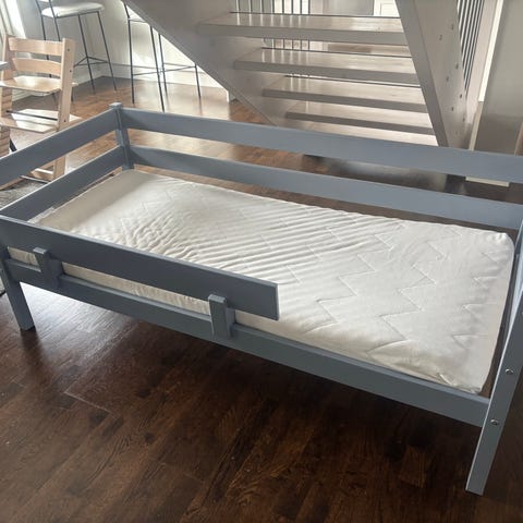 JLY Dream Junior Bed juniorsäng i grått utförande. Sängen är avsedd som övergångssäng mellan spjälsäng och vanlig säng. Den har ribbotten i trä och låga sidor med spjälor på båda långsidorna för att minska risken att barnet rullar ur sängen. Mått enligt märkning: madrassmått ca 70x140 cm. Passar för yngre barn som har vuxit ur spjälsäng men ännu inte behöver en fullstor säng.
