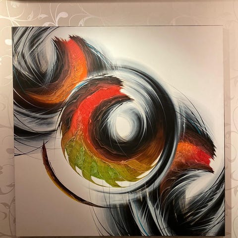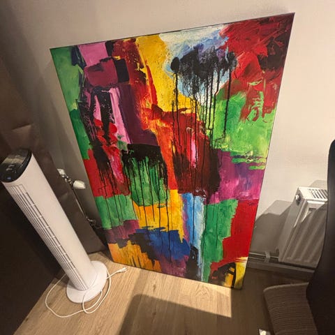 Tavla med motiv av apa i färgglad, abstrakt stil. Målningen är utförd i akrylliknande teknik med starka färger mot ljus bakgrund. Passar som väggdekoration i vardagsrum, sovrum eller kontor. Kvadratisk form, uppspänd på kilram och redo att hängas upp på väggen.