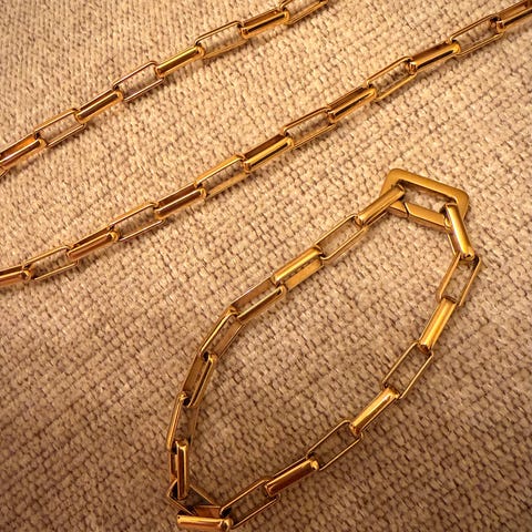 Skultuna relier petit halsband för kvinna i guldpläterat material. Kedjan består av avlånga länkar med rektangulär form och en större länk som låsdetalj. L. 50 cm