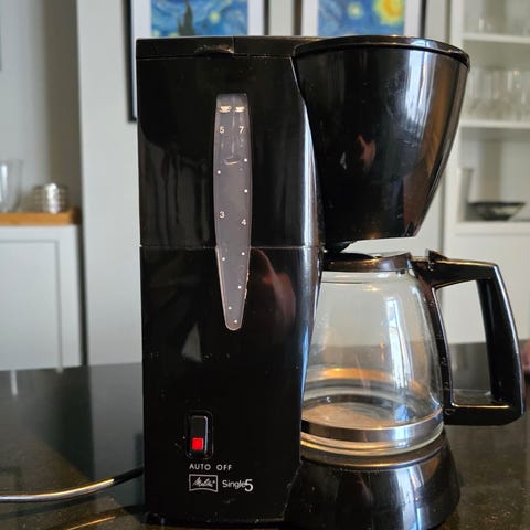 Melitta Look kaffebryggare i vit plast med glaskanna. Bryggaren har vattennivåindikator på båda sidor och ett svängbart filterfack för filterkaffe. På ovansidan finns vred för inställning av arom/kaffestyrka. Glaskannan har handtag i plast och graderad nivåskala. Strömbrytare och indikatorlampa sitter på fronten. Utrustad med fast nätkabel med jordad kontakt. Passar för bryggning av vanligt filterkaffe i hushållsmiljö.