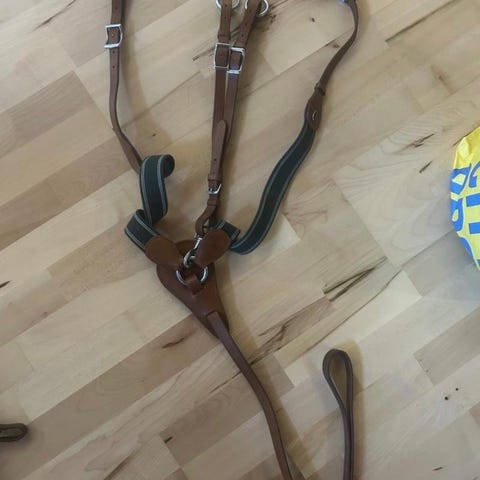 Brun storlek full. Gott skick, endast använd på tävling, dock ett litet skrap efter fästet på sadelgjorden (se bild). Komplett med martingal.