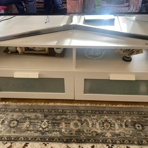 Vit 200 cm lång med 3 lådor, lådorna har svarta glas och fjärrkontrollen fungerar genom de