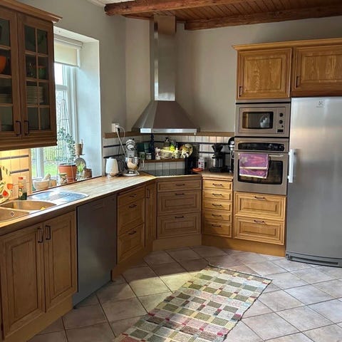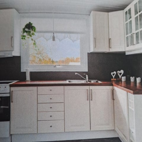 Köksskåp och köksinredning i ljusgul trä! Överskåp och underskåp med släta luckor och små metallhandtag. Bänkskivor samt lång rostfri diskbänk inkl blandare! Passar för komplett kökslösning eller som reservdelar till befintligt kök. Diskmaskin och fläkt ingår om intresse finns! Köket nedmonteras av köparen och går att hämta 2-6 april, viss hjälp finns att få! Vid intresse kan exakta mått på köket erhållas 30 mars då vi ej har tillgång till huset först då!