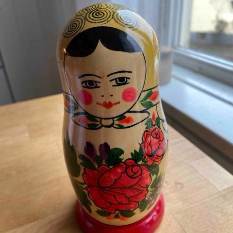 Set med 5 matryoshka dockor. Den största dockan är märkt "Made in USSR" och "2005" undertill. Dockorna är i trä och har handmålade detaljer.