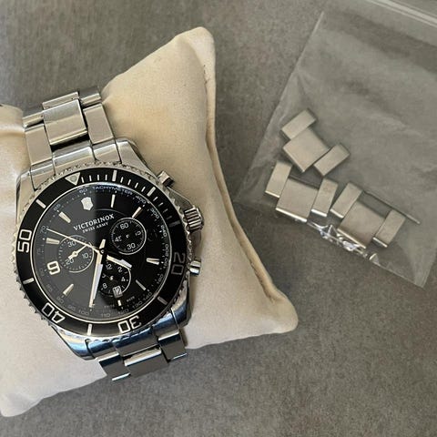 Gant herrklocka 44mm armbandsur med boett och länk i rostfritt stål. Klockan har blå urtavla med flera subdials och datumvisning samt vridbar bezel. Levereras med extra länkbitar för justering av armbandslängd. Passar för man.