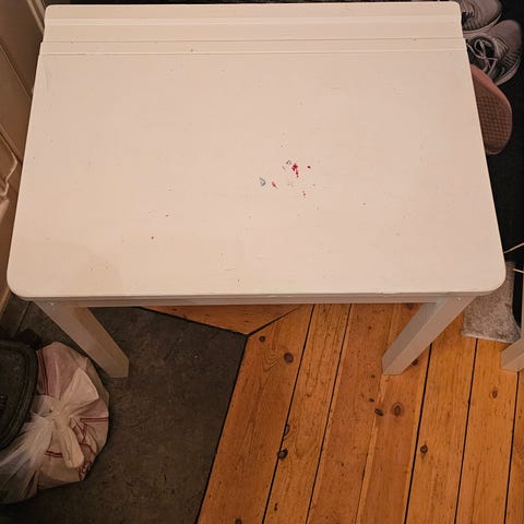Skrivbordet har uppfällbar bordsskiva med förvaringsutrymme under, lämpligt för förvaring av böcker, papper och pennor. Stolen är anpassad i höjd till bordet. Passar som pysselhörna i barnrum eller lekrum.