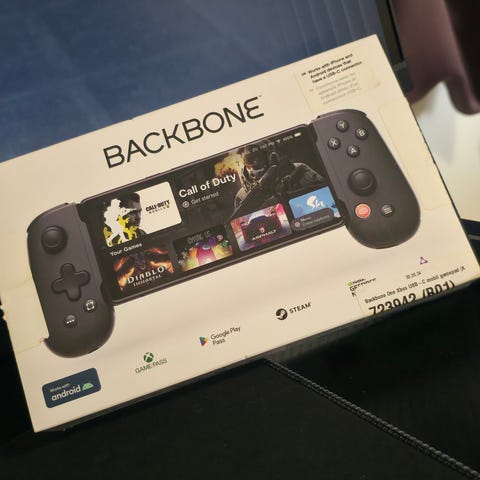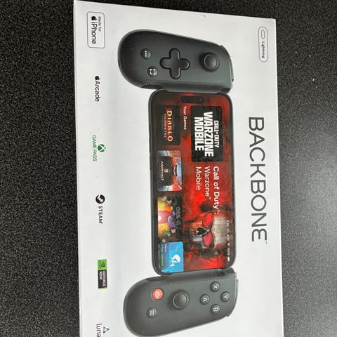 Backbone One spelkontroll för mobiltelefon i svart färg. Kontrollen monteras runt telefonen och ger fysiska knappar, styrspakar och triggers för mobilspel. Passar för spelstreaming och mobilspel där extern handkontroll stöds. Ansluts direkt till telefonen via inbyggd kontakt och har knappar placerade på båda sidor om skärmen för tvåhandsfattning.