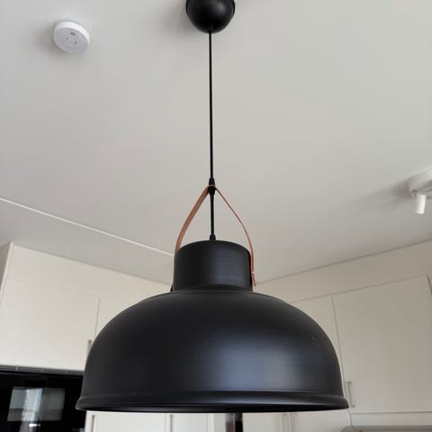 Säljer en Nordlux Strap 36 i mattsvart metall med snygga läderdetaljer. Lampan är i mycket fint skick och har en diameter på 36 cm.