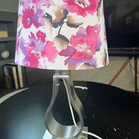 Bordslampa från IKEA, markfrost med ljuskälla och en skärm. Skärmen är egentligen till en hängande lampa.