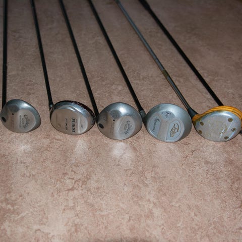 Set med Spalding golfklubbor bestående av fyra järnklubbor och en hybridklubba. Passar som komplett grunduppsättning för golfspel, exempelvis för träning eller spel på bana. Hämtas i Sollentuna.