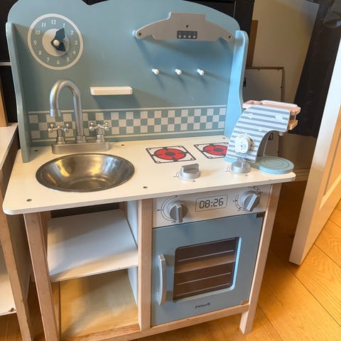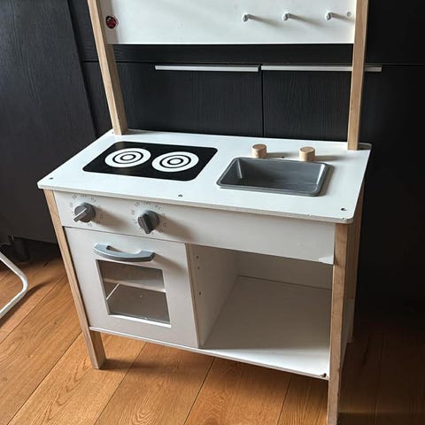Leksakskök från IKEA som vi även utrustat med spotlights (4 st), dekorplast samt krokar på ena sidan. Köket är välanvänt (se de sista bilderna) men skulle nog kunna bli riktigt fint igen med lite ny färg. Finns i Bålsta.