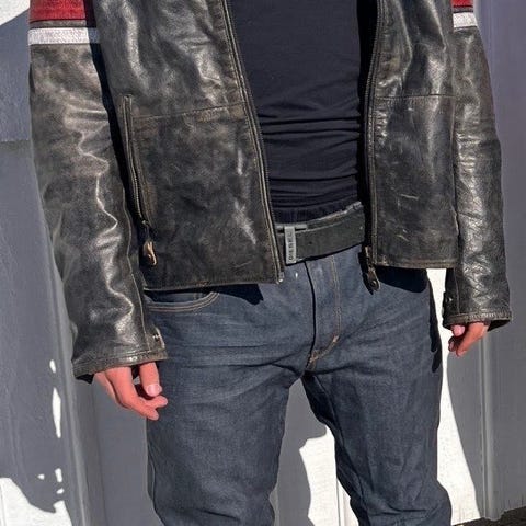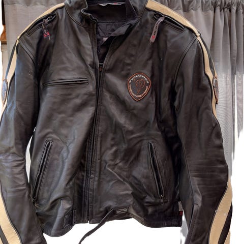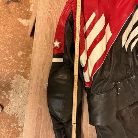Held mc jacka riktig läder, finns även skydd i gjort av kevlar storlek 46(UK) pris: 1500kr