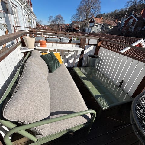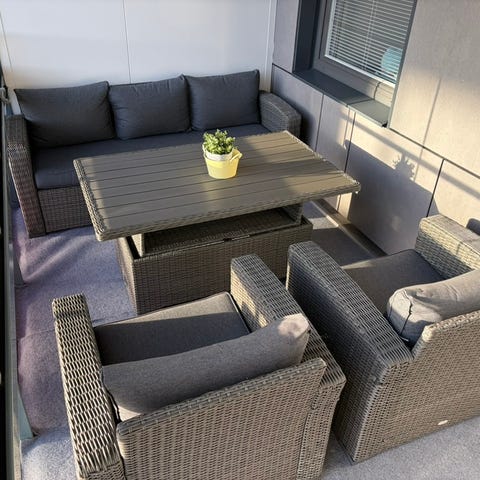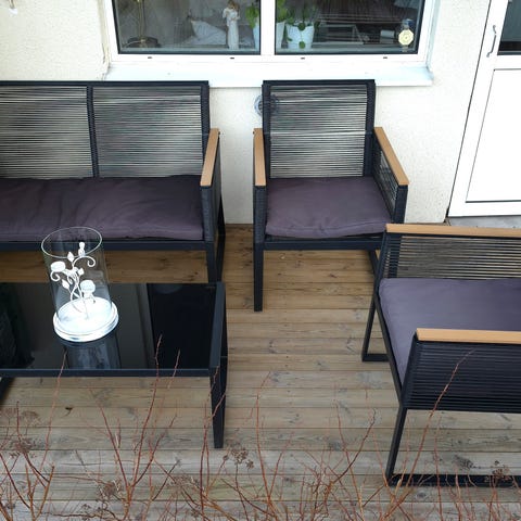 Utemöbelset soffa fåtöljer bord konstrotting grå