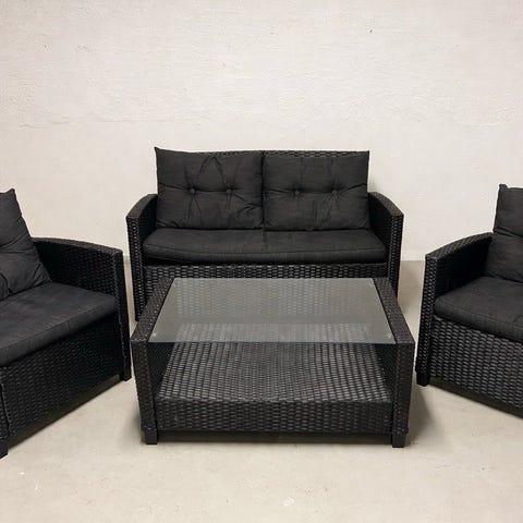 Utemöbelset i konstrotting bestående av en soffa, två fåtöljer och ett rektangulärt bord med glasskiva. Möbelgruppen är i mörkgrå konstrotting med grå sittdynor. Passar för användning på altan, uteplats eller balkong som sittgrupp för flera personer.