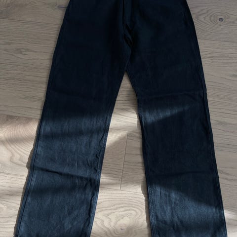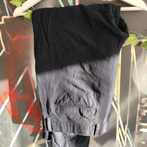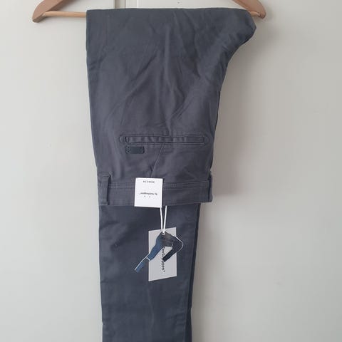 Mörkgrå byxor med fickor fram och bak. Byxorna har en knapp och dragkedja framtill. En liten defekt finns vid dragkedjan, ett litet hål.