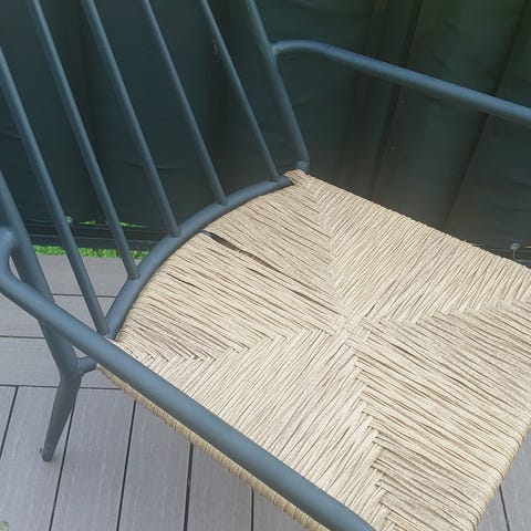 Utemöbel set bestående av ett rektangulärt bord och stolar i svart metall med ribbad sits och rygg. Armstöd i trädetaljer ger kontrast mot den svarta metallramen. Möblerna är anpassade för utomhusbruk, till exempel balkong eller altan. Bordet har slät bordsskiva i metall och stolarna har öppen konstruktion som underlättar avrinning av vatten. Passar som sittgrupp för mindre ytor där man vill ha ett kompakt bord med tillhörande stolar.