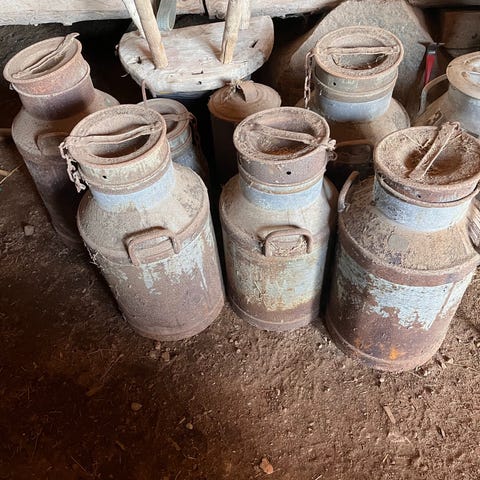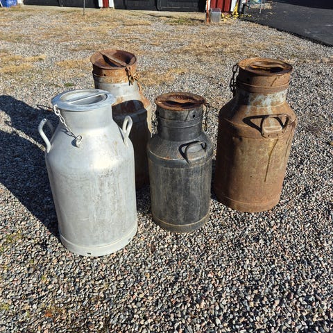 Gamla mjölkkannor i metall, en blå och en grön med patinerad yta. Båda kannorna har handtag upptill för lyft och bärning. Lämpliga som inredningsdetaljer, dekoration eller för förvaring i exempelvis ladugård, förråd eller trädgård.