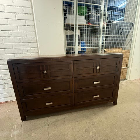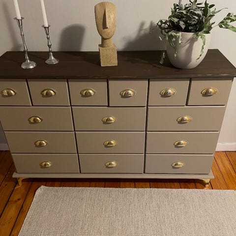 Gedigen grönmålad byrå, helt i trä, med skålhandtag i guld. Dom två översta lådorna även målade invändigt.