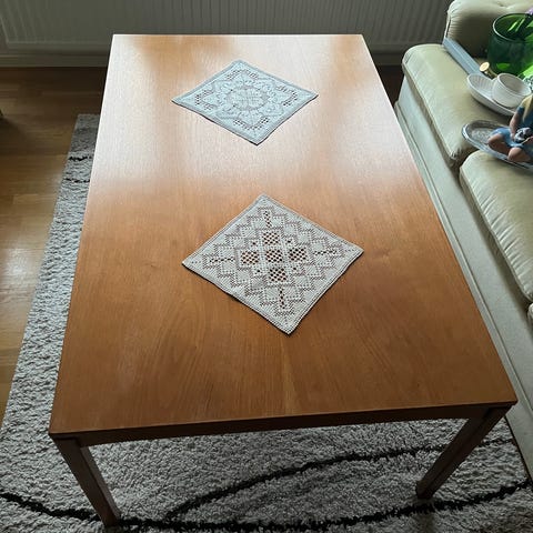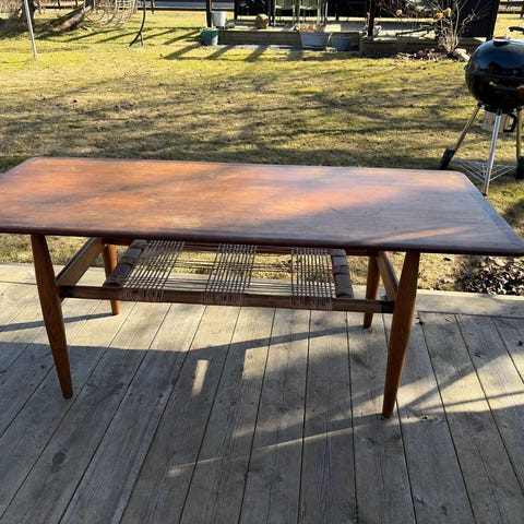 Säljer ett stilrent soffbord/sidobord i massiv teak med vacker, varm ton och naturlig ådring. Bordet har en klassisk skandinavisk design som passar lika bra i moderna som retro-inspirerade hem.