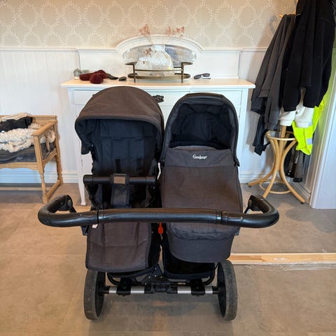 Emmaljunga syskonvagn med två sittdelar placerade i rad. Vagnen har grå klädslar och svart chassi med fyra hjul. Justerbart handtag och varukorg undertill. Passar för transport av två barn samtidigt, exempelvis syskon eller tvillingar, i stadsmiljö och på promenader.