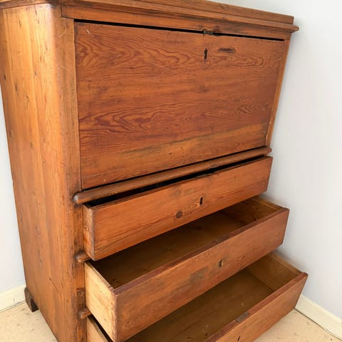 Mått: 130 cm bred , 50 cm djup , 130 cm hög, skivan sticker ut 47 cm från sekretären när den är nerfälld.