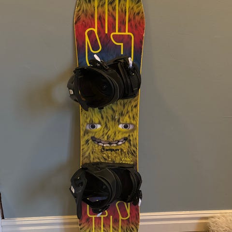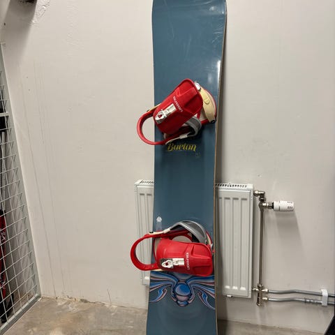 Burton snowboard med bindningar. Brädan har en flerfärgad ovansida med stora grafiska tryck och en undersida med Burton-logotyp. Utrustad med justerbara bindningar i grön nyans. Passar för allmän snowboardåkning i pist eller park. Exakt längd och modellbeteckning framgår inte av bilderna.