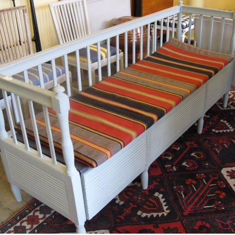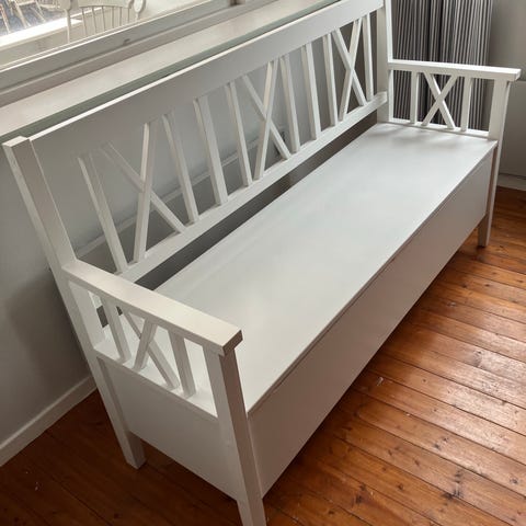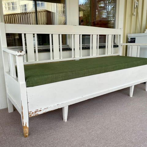 Vitmålad gedigen kökssoffa med beige tvättbar dyna. Under sitsen finns rymligt förvaringsutrymme. Lite slitage i färgen på armstöden men i övrigt i fint skick.