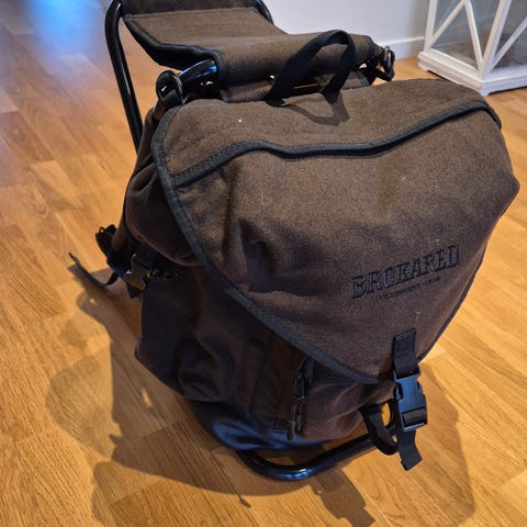 Ryggsäck med integrerad fällstol i kamouflagemönster. Stommen är i metall med sits upptill och ryggsäcken är fäst på ramen. Justerbara axelremmar och midjerem för bärkomfort. Flera fack och remmar för packning. Lämplig för exempelvis jakt, fiske, camping eller andra utomhusaktiviteter där både packning och sittplats behövs.