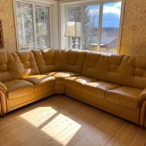 Vit hörnsoffa i äkta skinn med fotpall