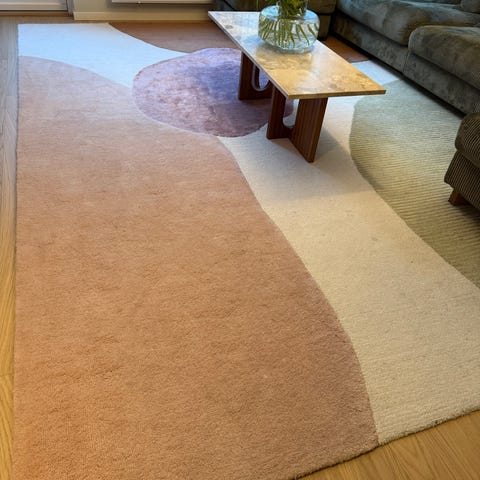 Jotex EMERENTIA viskosmatta i flerfärgad design med organiskt, asymmetriskt mönster i beige, grått och rött. Mattan är tillverkad i viskos med mjuk, glansig lugg som ger en len yta. Rektangulär storlek ca 140x200 cm, lämplig för exempelvis vardagsrum, sovrum eller matplats där en mellanstor matta önskas.