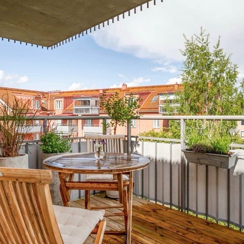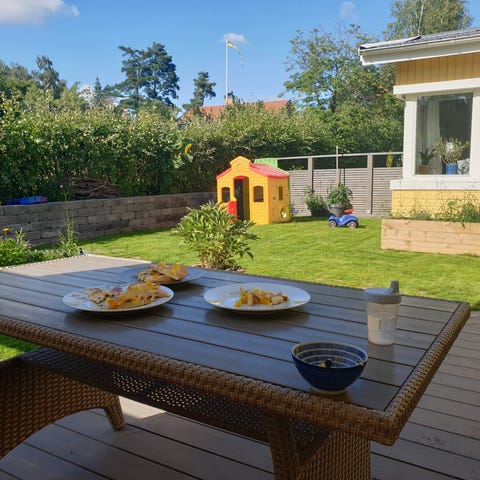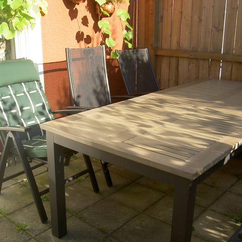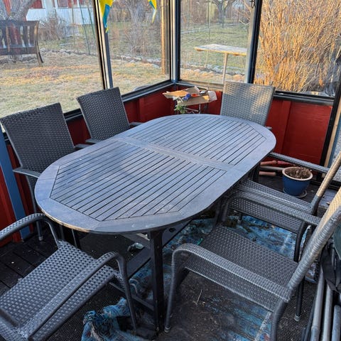 Matgrupp för utomhusbruk bestående av ett rektangulärt bord och flera stolar i gul färg. Bordet har fyra ben och slät bordsskiva. Stolarna har ryggstöd och sits i samma färg som bordet. Möblerna är avsedda för placering på uteplats, altan eller trädgård. Mått på bord och stolar framgår av bifogad bild med måttangivelser i centimeter.