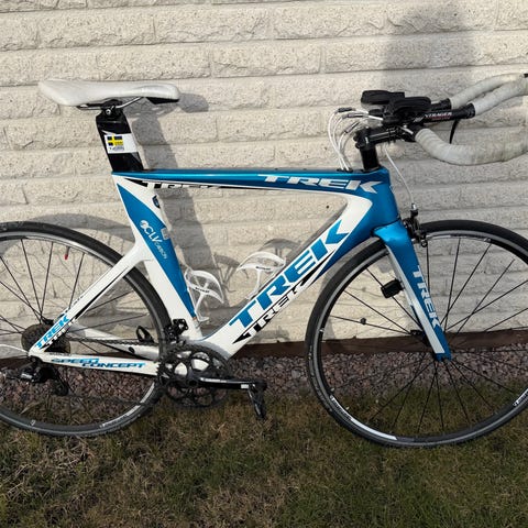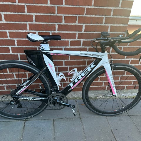 Trek racer i svart färg. Cykeln har bockstyre med extra aerostyre, smal landsvägsram och smala däck. Bakhjulet är monterat i en träningsrulle för inomhuscykling. Har shimano sora växlar och fälgbromsar fram och bak. Passar för landsvägscykling och träning på trainer inomhus. Har det andra däcket så det går lätt att byta. Stl 50? (Är lite osäker på det men jag är 163cm lång och passar mig perfekt. ) Säljer allt även träningsrullen och extra styre, däck m.m. för det billiga priset, då intresset har svalnat. Cyklen är helt ny, bara ett fåtal mil på den.