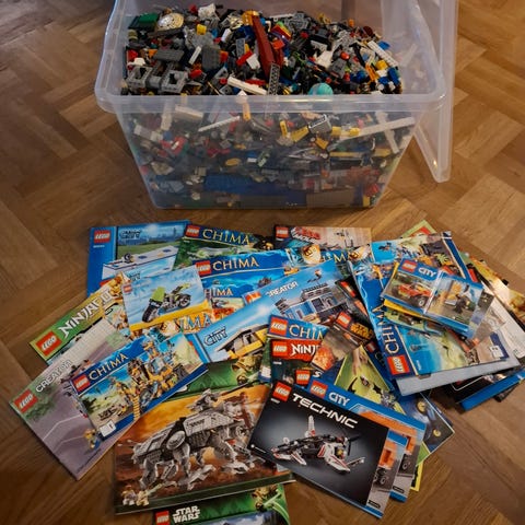 LEGO City byggset med blandade modeller. Innehåller flera olika City-byggsatser med fordon, byggnader, tågdelar och tillbehör, enligt bilderna. Delarna är blandade i kartong och flera originalinstruktioner för LEGO City-set ingår. Passar för lek, byggande av egna städer och komplettering av befintliga LEGO City-samlingar.