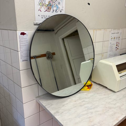 Rusta rund spegel med svart ram. Spegeln har en enkel och neutral design som passar i olika rum som hall, sovrum eller vardagsrum. Den runda formen ger en mjuk känsla och kan placeras både stående mot vägg eller upphängd beroende på önskemål och tillgängliga fästen.