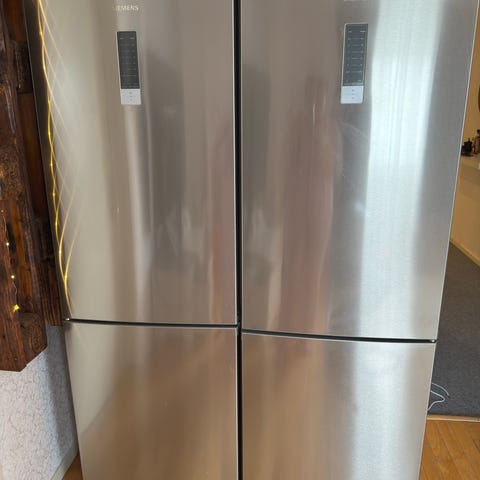 Smeg kombiskåp kyl och frys i rostfritt stål. Skåpet har dubbeldörrar upptill för kylutrymmet och två separata lådor nedtill för frys. Invändigt finns flera glashyllor, dörrhyllor samt grönsakslådor för organiserad förvaring. Utsidan har en integrerad displaypanel med inställningar för temperatur och funktioner. No frost-teknik minskar behovet av avfrostning. Passar som fristående kombinerat kyl- och frysskåp i kök eller grovkök.